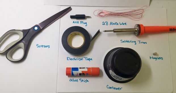 Auriculares DIYPaso 1: Reunir todos los materiales Taza plástica / taza de espuma de poliestireno2 imanes de neodimioCinta aislanteEnchufe AUXAlambre de cobre (calibre 20)Palillo del pegamentoPapel de lijaTijerasPinzas de cocodrilo (opcionales)Paso 2