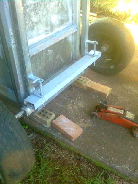 Una pieza de 1 metro de acero caja de 100 mm x 50 mm puede ser perforada por lo que cabe bajo los accesorios de riel como se muestra y un pin de carril puede caer a través de lo. Bajo está soldado en un pedacito pequeño del ángulo de cada lado para sentarse encima y mantener el árbol que es apenas un viejo árbol del acoplado con todo quitado.