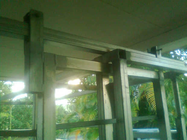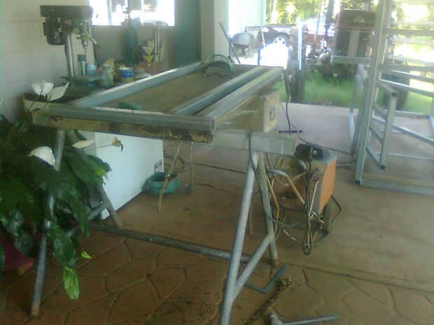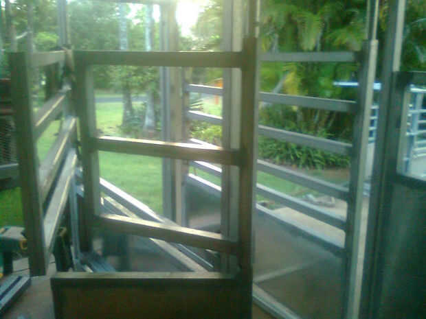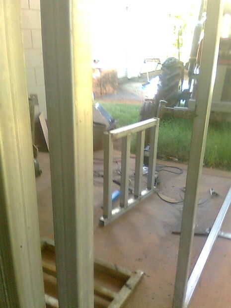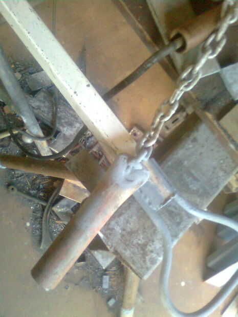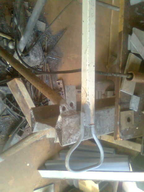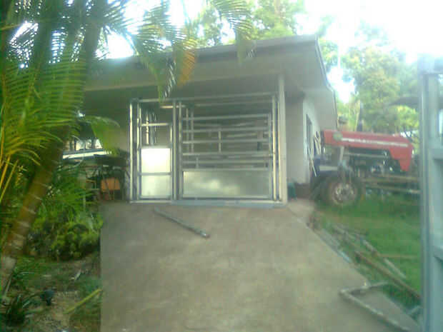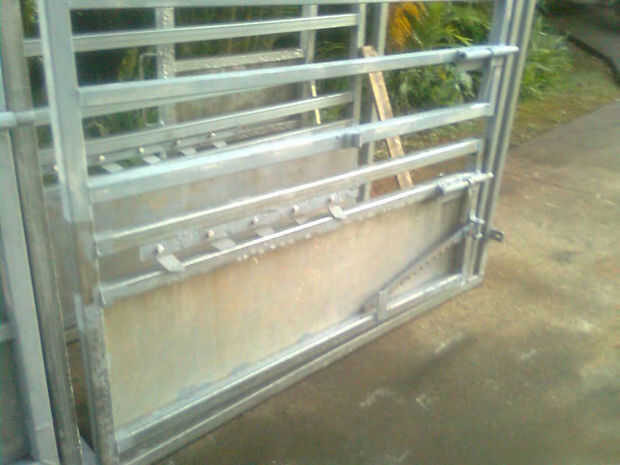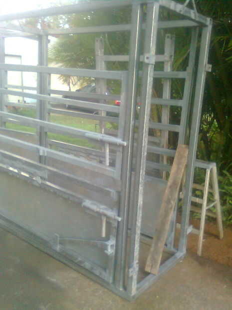 Entre los rieles es una barra de acero de aproximadamente 1 metro perforado con agujeros en los centros de 100 mm (ver fotos) y gotero en forma pequeñas piezas se empernan sobre para que una barra de 40 x 40 mm de aprox. 1200 mm puede ser empujada a través al otro lado y entonces empuja hacia delante de cada lado para empujar el ganado al frente y mantenerlos exprimida encima de la parte posterior también. Poner un mango en forma en él según los diagramas y fotos. Hice hasta unos pocos para uso práctico en otras partes de las yardas