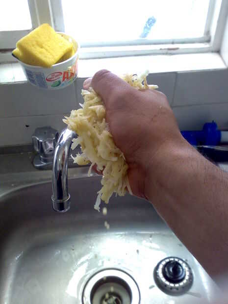 .. .y apretón hacia fuera de tanta humedad como sea posible, con las manos o envolver en alguna gasa o un paño de cocina limpio.