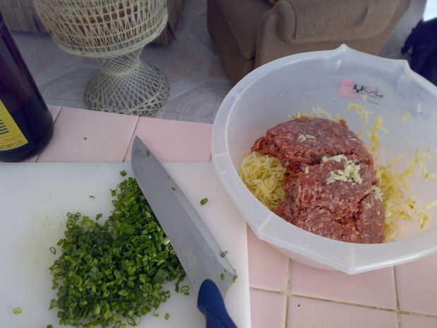 Paso 6: Ahora picar la cebolla de verdeo y el ajo y añadir a la carne