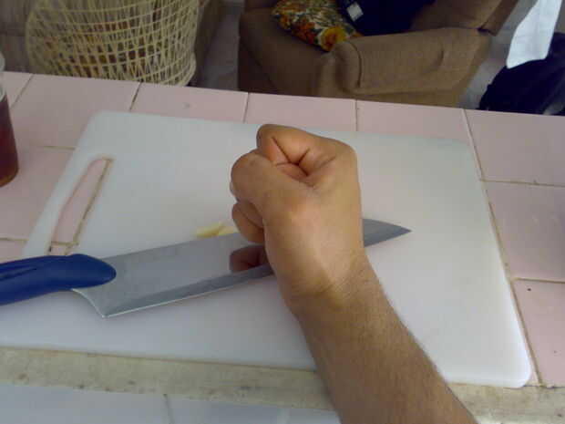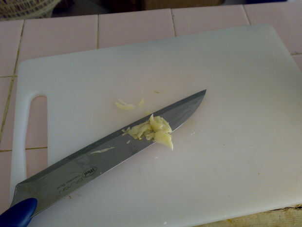 Una forma muy fácil de picar ajo es colocando la parte plana del cuchillo de un cocinero sobre los dientes y sólo ventilación hacia fuera sus frustraciones sobre él. Sólo tenga cuidado de que no salpicar ajo machacado todo tu cocina