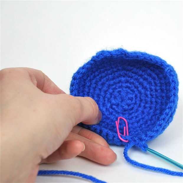 Estas filas siguientes son más como medio filas, lo que significa que funcionará en un lado del casco, luego volverán y hacen otra. - (esto es donde se pone complicado) (Lado 1) Seguimiento de última puntada con marcador, SC. 13, Cap. 1, vuelta y sc 13 al marcador. (13 de este lado)