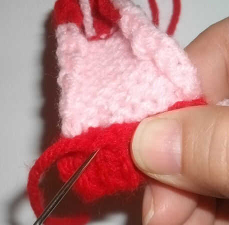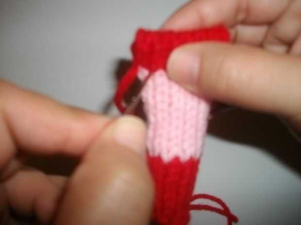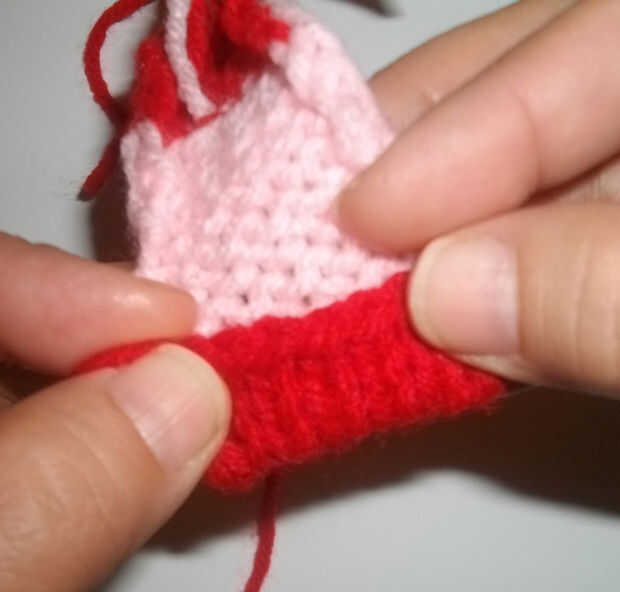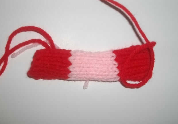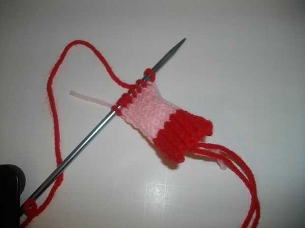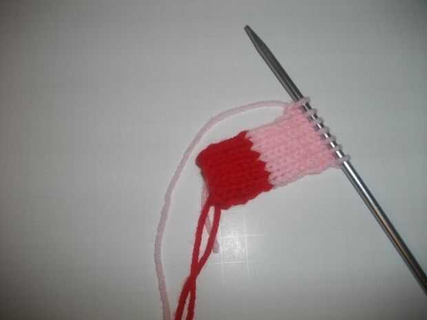 Filas 1-7: trabajo Jersey con punto uno (fila de la derecha) y revés de un final de fila (del revés) en la fila de puntilla. Cortar el hilo rojo dejando una cola de alrededor de 4 pulgadas para utilizar más adelante para coser el doblez. Hilera 8-17 en el principio de cambio de fila 8 para el hilo rosa y continuar el Jersey en una fila puntilla cortar el hilo rosa.