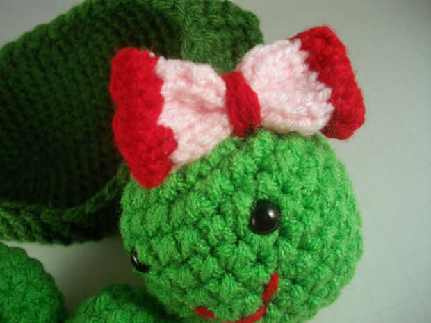 Utilizar las imágenes como una guía de cómo doblar los extremos del arco y coser. Corte un pedazo de hilo rojo 12 pulgadas largo utilizará esto para enrollar alrededor del centro del arco Asegúrese de dejar ambos extremos bastante el arco y asegúrelo a la parte superior de la cabeza de guisante. Utilizar las imágenes como guía.