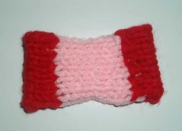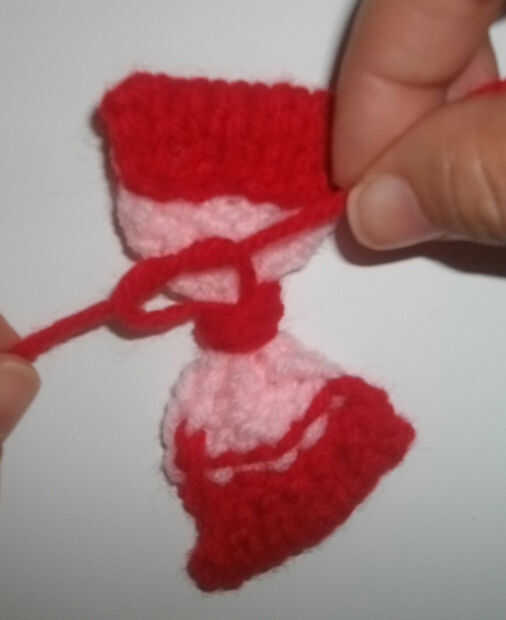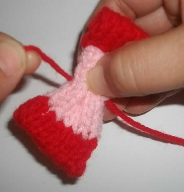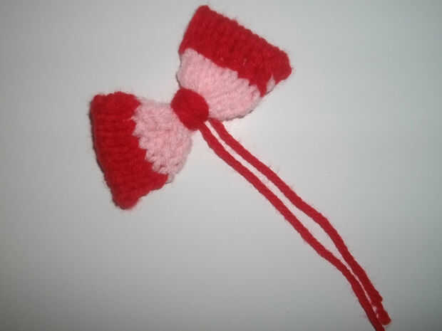 Cambiar al hilo rojo y el mismo patrón que filas 1-7 no olvide atar en el lado derecho dejan una cola de alrededor de 4 pulgadas para coser el doblez. Doblar el arco en los extremos para dar el arco un borde limpio.
