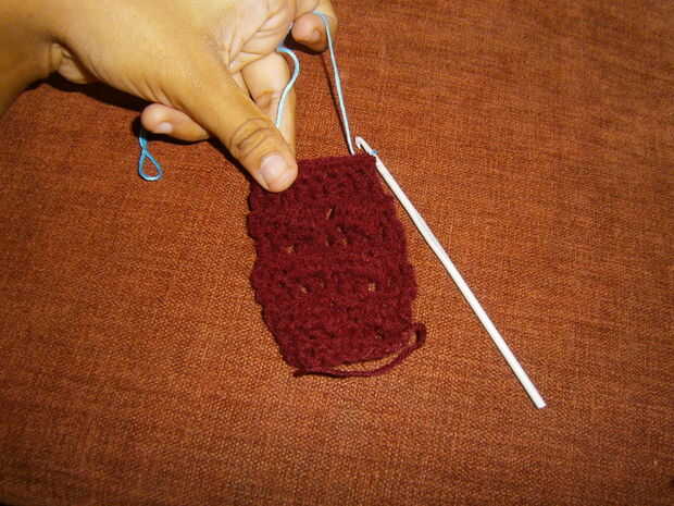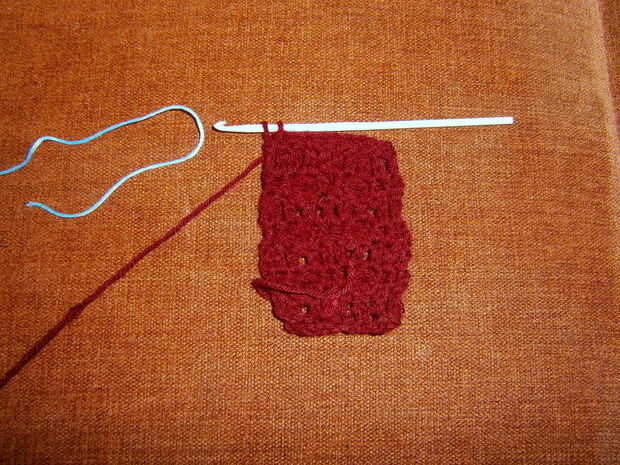 Al final de la última fila, en lugar de recoger el mismo hilo de color, elija el siguiente hilado del color que desee.