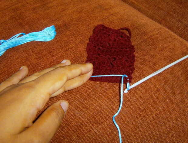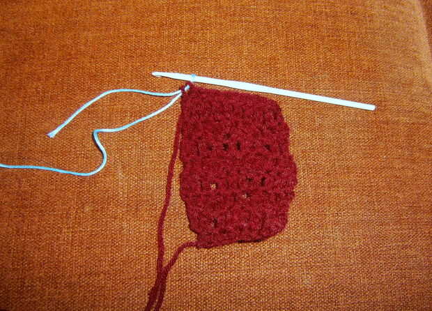 Cuando vayas a la siguiente cuadra de color primero hacen ganchillo solo dos. Sólo entonces la puntada bobble aparecerá en la parte delantera.