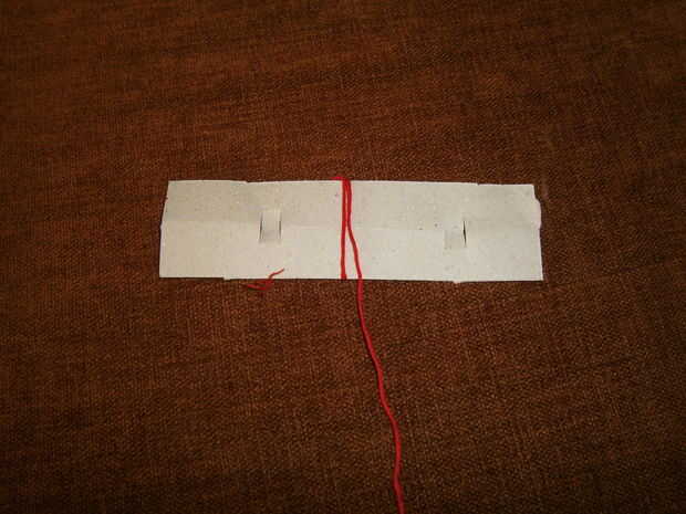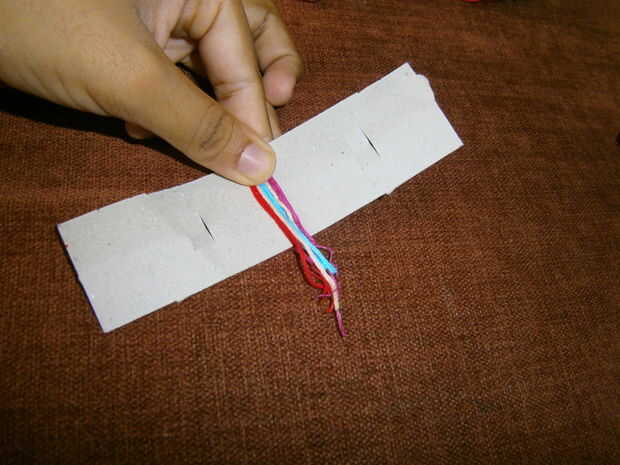 Primero viento diversos hilos de rosca coloreados como alrededor de un papel grueso.