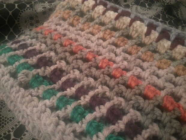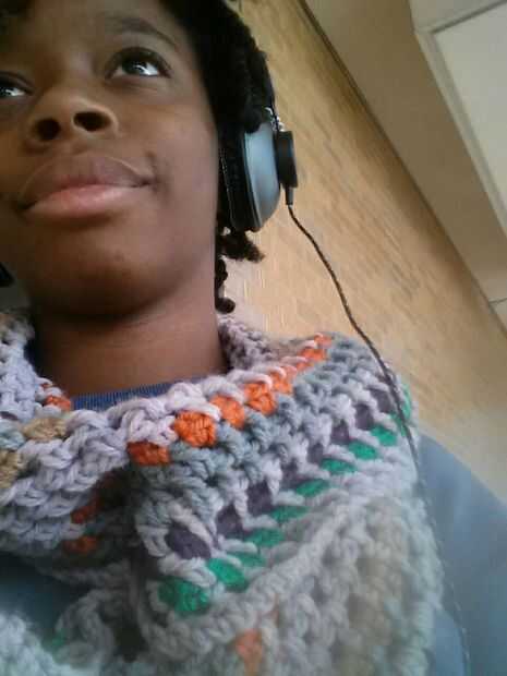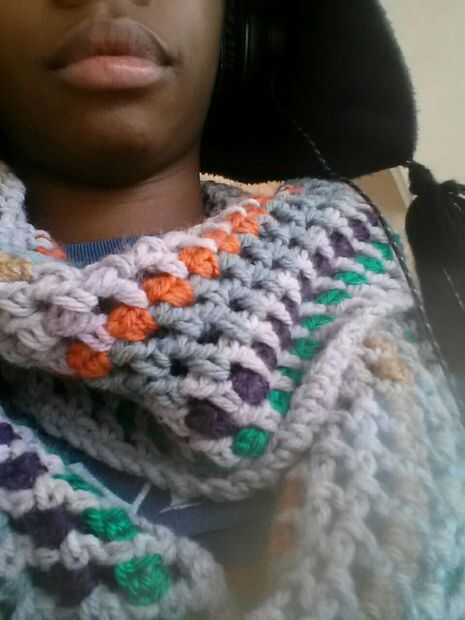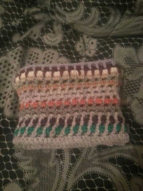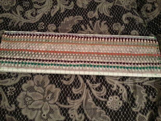 Primero encadenaron 226 puntos. Puede parecer como mucho pero cuando yo fui encadenando sólo quería la bufanda para caber alrededor de mi cabeza dos (ahora cabe alrededor tres) veces y yo no estaba realmente hasta luego. Pero cualquier número de cadenas tienes que es un número par. El patrón se trabajó con cada otra puntada, por lo que ayuda a tener una longitud de puntada incluso. Cuando llegué a casa un día vi dos bolsas de nada pero hilado y estaba tan contento! No sabía que ella me compró hilo algunas que acabo de hacer mi día. Y algunos de ese hilo en esta bufanda. El verde, morado y naranja fueron el regalo sorpresa. El hilo de color gris púrpura es el resultado de mí intentando teñir el hilado acrílico. Si no sabes hilado de acrílico no tiene tinte y sin embargo todavía intentado teñir algunos. Me gusta un poco cómo salió sin embargo. El resto del hilo es de mi stash de lana. Cuando terminé las dos últimas filas hicieron la bufanda más grande y un poco curvados hacia fuera. Para corregir algo, me bloquearon mi bufanda en un tablero de cartón patrón y cubrió los laterales a los lados. Lo ayudan a definir las doble crochets y hacer la bufanda un poco más. Puede haber funcionado mejor si me hade mojar el pañuelo y luego alfileres, pero porque no quiero arruinar mi tabla patrón cubrió a lo seco. La dejé en un rincón de mi habitación para lo que iba a ser dos días en una semana. Este paso es opcional, que sólo quería hacer que los espacios se destacan un poco más (y para fijar la parte superior).