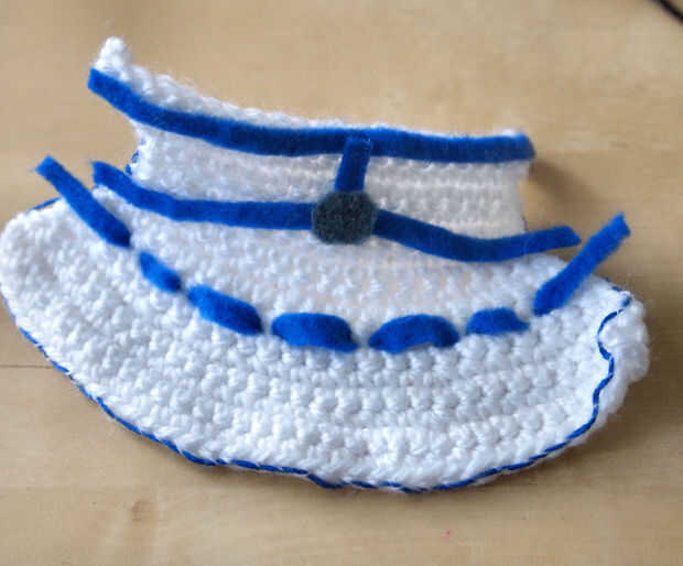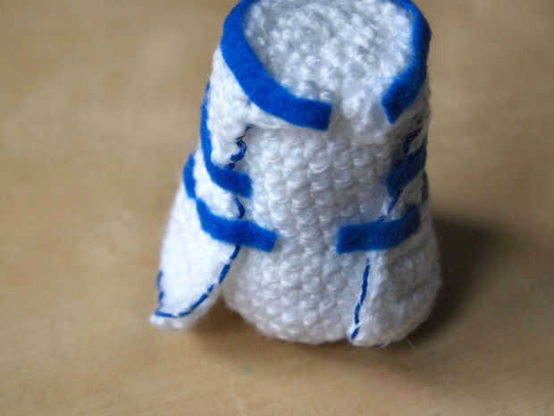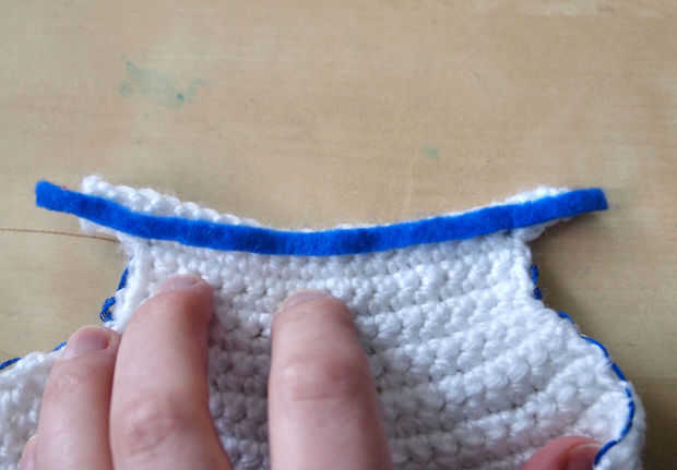 • Corte unos trozos finos de fieltro azul para las correas de capa de Liara las dos piezas superiores en que pegué.