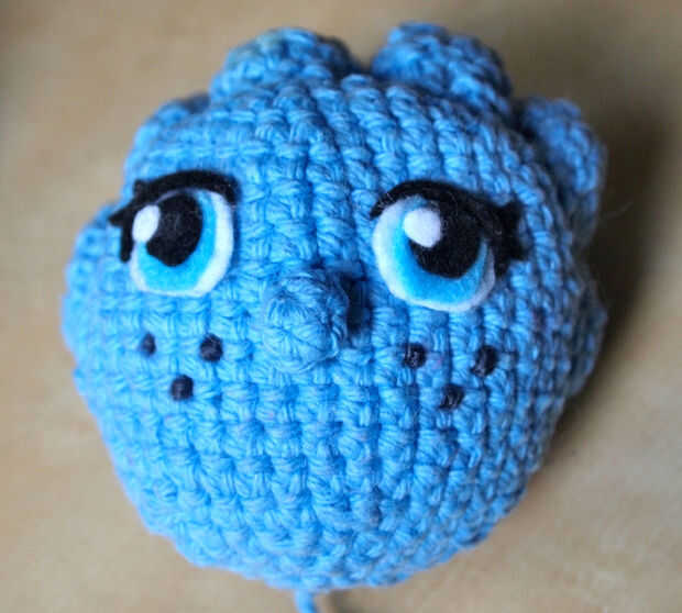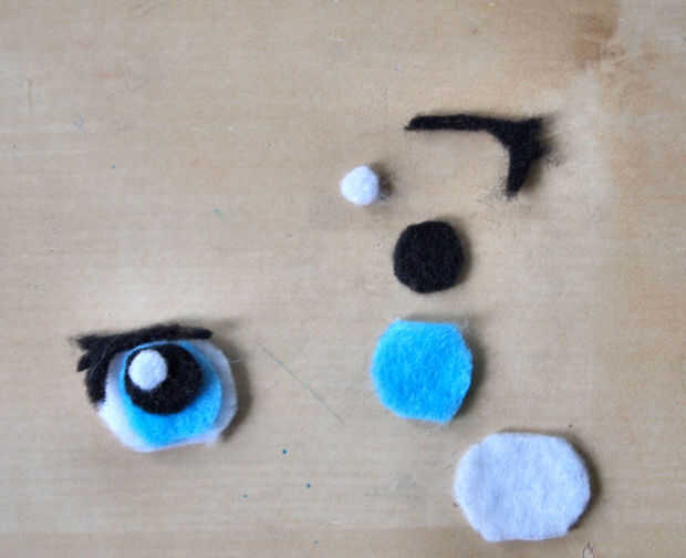 Creé los ojos con fieltro azul, blanco y negro y había pegado en el.  Hice nudos con hilo gris para las pecas. Luego cosí la nariz a la cara.  Iba a hacer un boca con hilo de bordar pero simplemente no pude conseguir que mira a la derecha.  Una vez que se hizo la cara cosí la cabeza sobre el torso.