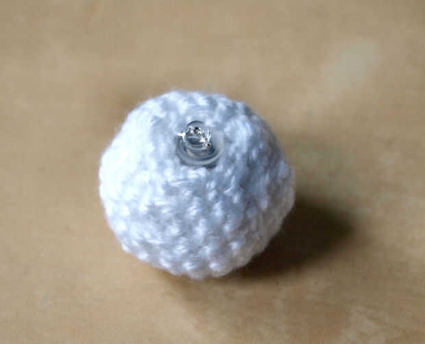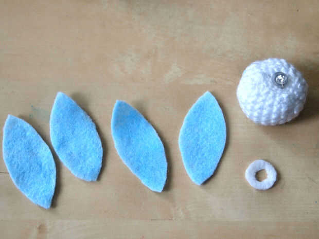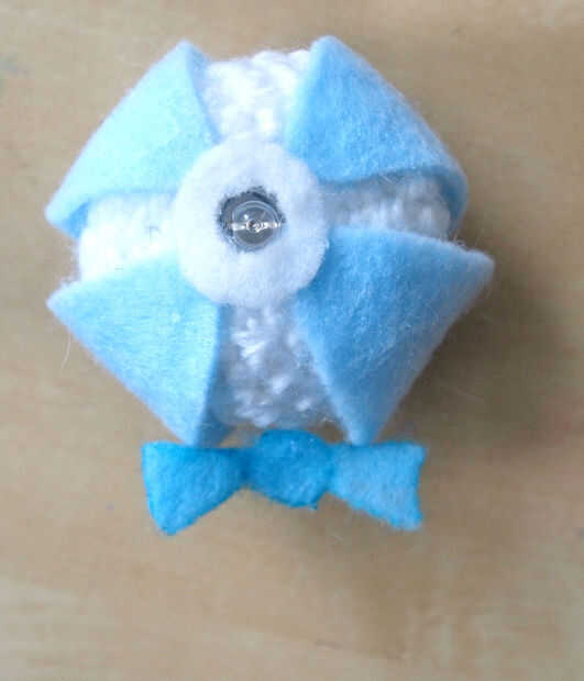 Pon la luz interior y el relleno alrededor de ella. Cortar piezas de fieltro como en la imagen 5 y pegamento en la bola de ganchillo. No olvides la pequeña pajarita, até con un hilo.