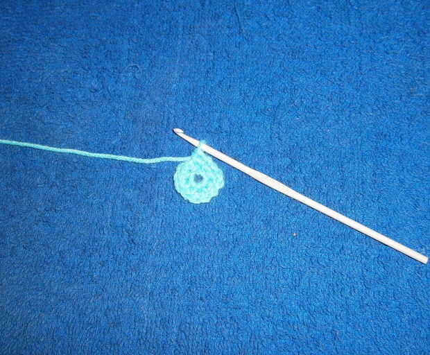 Ronda 1: * 1 MP en el MP del círculo mágico. 2 sc en el siguiente punto de la circle.* mágica repetir * a * hasta el final de la ronda. Acabado en una puntada de resbalón. (12)