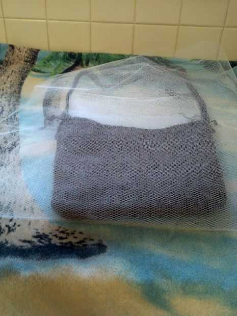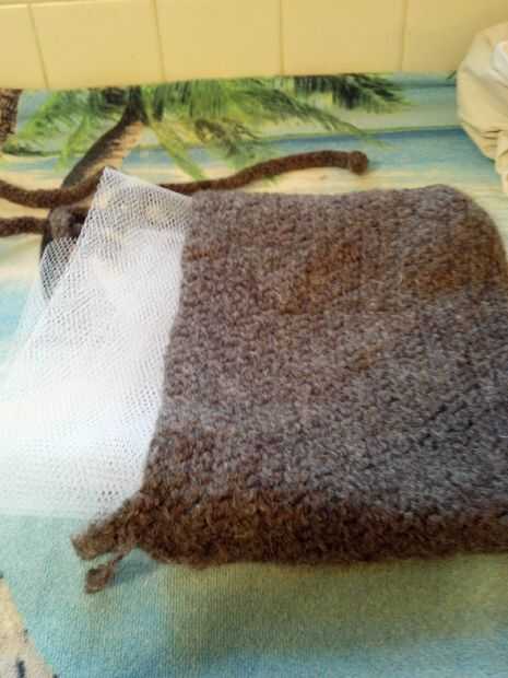 Plan B, utilicé la cocina con una toalla de playa para absorber el exceso de agua thenI rellena el interior de la bolsa con la red entonces envuelto en la red alrededor de la bolsa. La red se utilizará para ayudar a la adgitation o la mezcla de las fibras de lana.