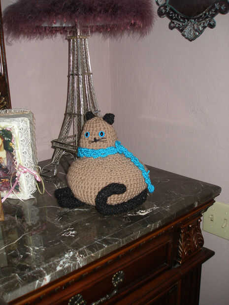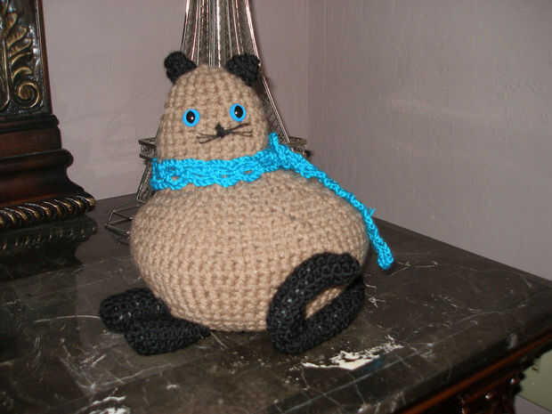 El hilo principal es peso peinada, y para los bigotes, utilicé los Patons gracia en negro y una aguja de hilo. Romeo tiene un collar azul, por lo que un "collar" en León marca hilo Microspun de color azul brillante con un gancho de crochet de tamaño H de ganchillo. Aquí están las instrucciones: