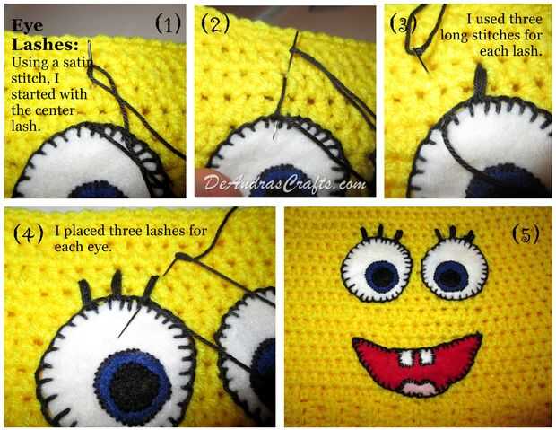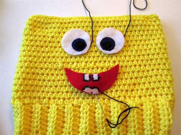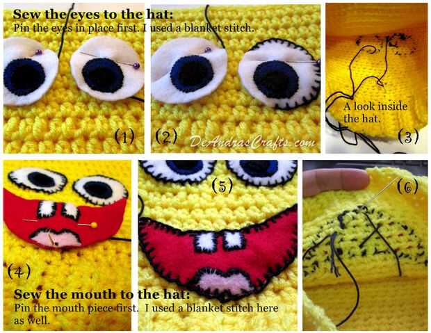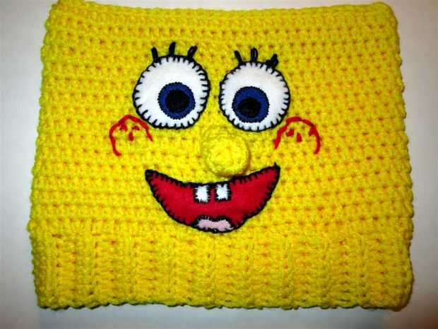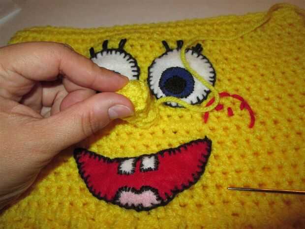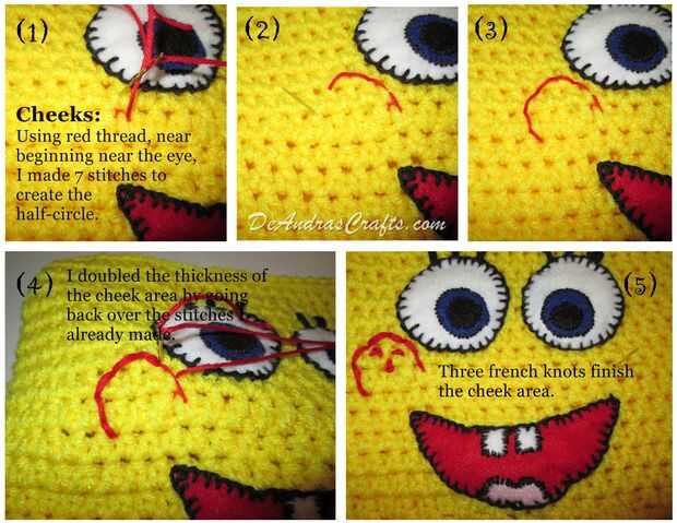 Bob esponja sombrero utiliza un combo de una nariz ganchillo, fieltro ojos y boca que fueron cosidos a mano en el sombrero usando hilo de bombón y varios tipos de puntadas.