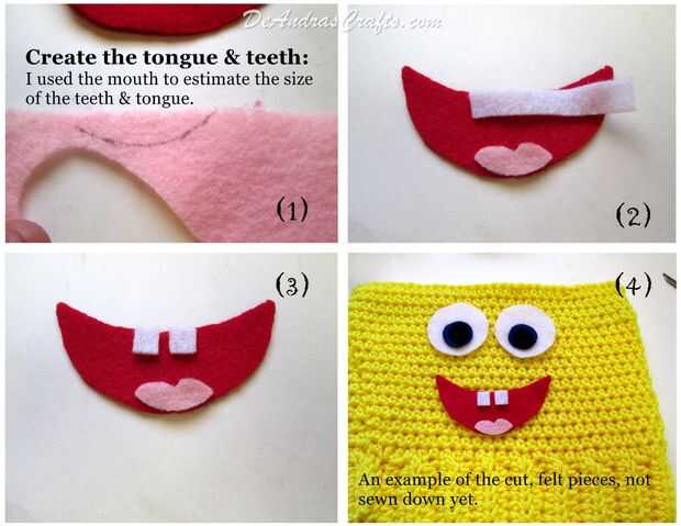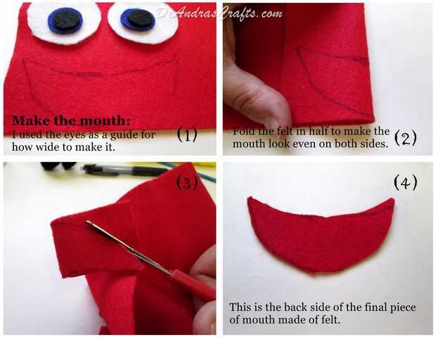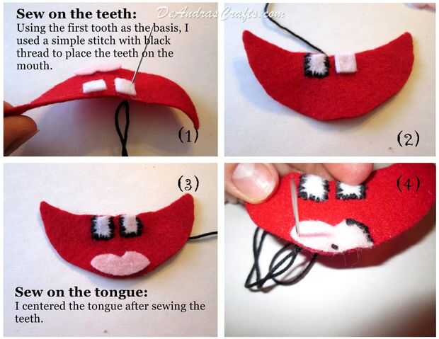 Para boca, la lengua y los dientes, utiliza fieltro rojo, rosado y blanco.