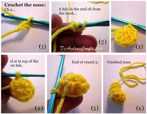 El último paso así que no es de la manera, mientras los detalles de bordado, tome el extremo largo de la nariz de ganchillo y centro entre los ojos, comenzando sobre la misma fila que el punto más bajo de los ojos.