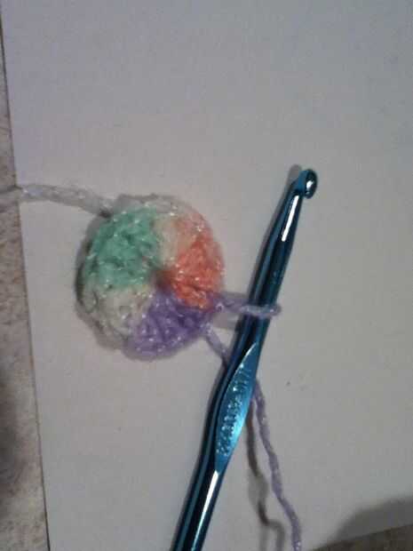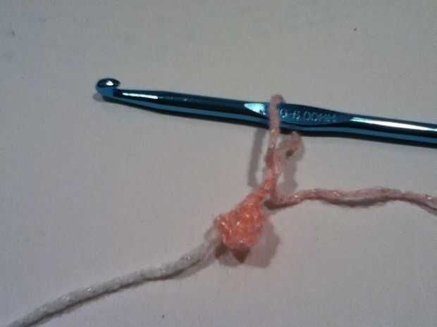 Cadena 3. Doble crochet en el círculo que acaba de hacer. 12 DEL CC. Puntada de resbalón en la parte superior de la cadena.