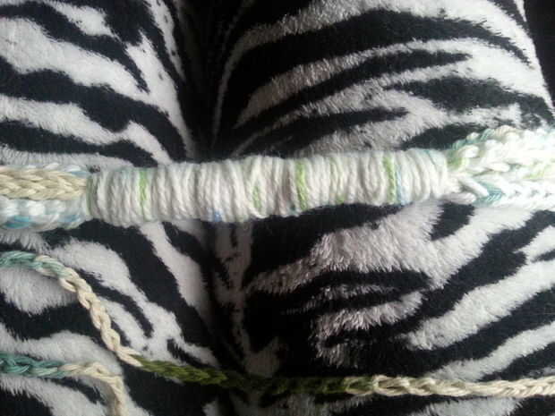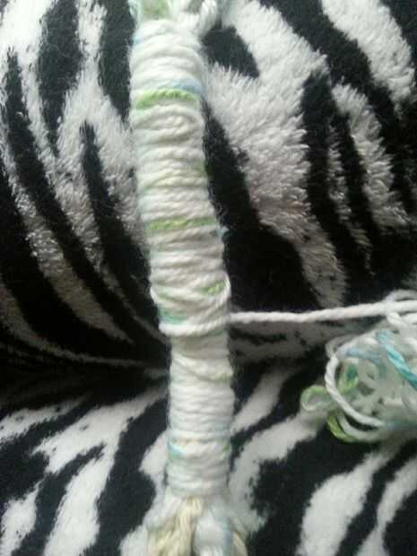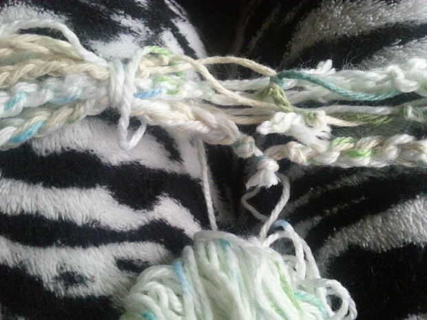 en 100 puntos.Una fila de punto.Cambiar el hilo, dejando 12 pulgadas "cola" en cada extremo.Una fila de punto.Seguir, cambiando de hilo con cada fila, dejando una "cola" en cada extremo de la fila de 12 pulgadas.