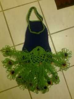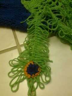 Después los lazos / fringe es hacer hice un racimo, o palomitas de maíz tipo puntada en la última cadena de las plumas de color púrpura. Esto comienza ojos de las plumas.