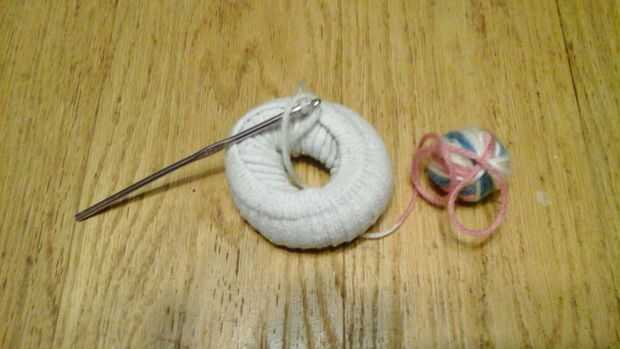 Comience con un nudo deslizante en su gancho y bucle del hilo a través del "agujero de Dona" del calcetín.