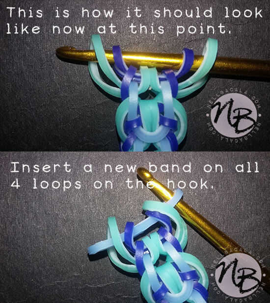 En este punto, el gancho debe tener 4 lazos en el gancho (ver foto superior.). Insertar una nueva banda (azul pastel) a través de todos los 4 bucles en el gancho, no cerrar todavía.