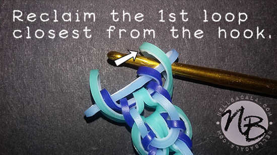 Recuperar el primer lazo lo más cerca posible del gancho. Por favor vea la flecha señaló que banda es el bucle 1 (banda verde pastel) para reclamar.