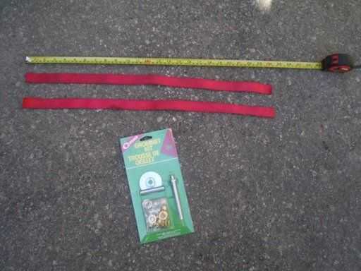 En primer lugar se necesita un juego de anillos disponible en wall-mart o en otras tiendas en el Departamento de camping. Usted necesita comenzar a cortar 2 piezas de una vieja correa, 2 pies cada uno.