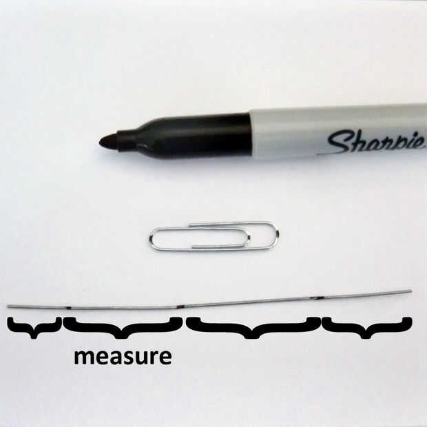Esto significa que basado en la longitud de la varilla de aluminio podemos hacer un clip aproximadamente 24 veces más grande que nuestro clip de referencia. Podemos aplicar este número en relación a cada una de las medidas y aplicar las nuevas medidas a la varilla de aluminio, esto le dará una indicación sobre donde deberían ser las curvas.