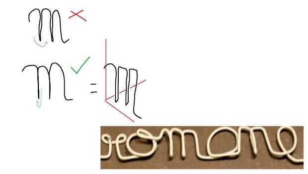 Como usted habrá adivinado al dibujo de la palabra en su cuaderno; para algunas letras deberás hacer pasar varios que se superponen. Una cosa que he aprendido al hacer el colgador es pensar en 3D. El cable no tiene que permanecer como en una hoja de papel ya. Si nos fijamos en la imagen de abajo; la "m" de romane, he doblado el cable a la parte de atrás (como si le introduce la hoja de papel) para volver a subir. El resultado es mejor.