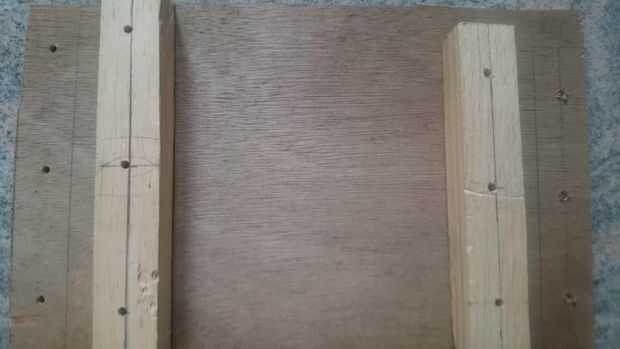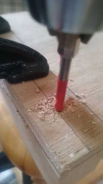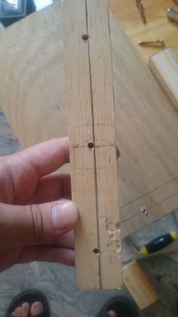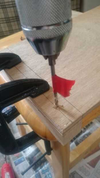 Marca la punta de la broca en el punto medio incluso 3 secciones en 2 bloques de madera del corte, luego pinza la pieza con el polywood en su borde (una sola pieza después de uno después de la perforación) uso 4 mm de diámetro de madera taladre la cabeza, que poniendo la cabeza en la mano perforar.