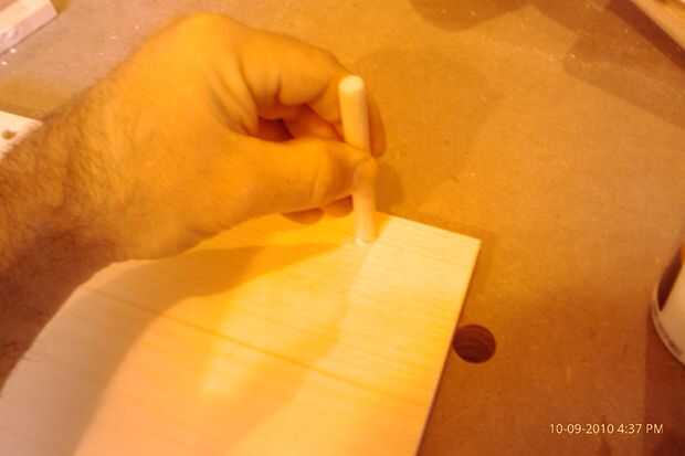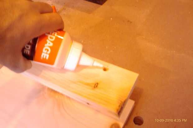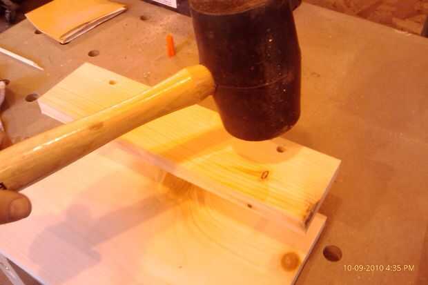 Luego, colocar la pieza pequeña en la parte superior y un martillo la pieza la mitad. Aplicar pegamento en los orificios y un martillo la pieza a través de todo el camino.