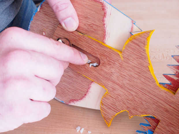 Una cala se atornilla en la parte superior de la espalda de la forma de pájaro. Esto se utilizará para colgar el perchero.