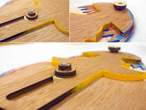 Un sándwich de recortes de madera ovales guarnición dentro de la guía hizo y atornillado en la parte posterior de la parte inferior del huevo a través de la vía de parte de aves. Una forma ovalada es importante dentro de la vía ya que mantiene la acción de deslizamiento lineal. No apriete el sándwich de madera deslizantes, debe ser seguro pero lo suficientemente suelta para permitir una acción deslizante.