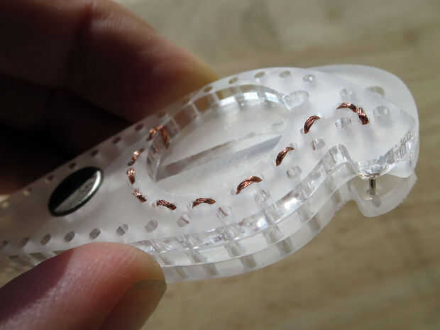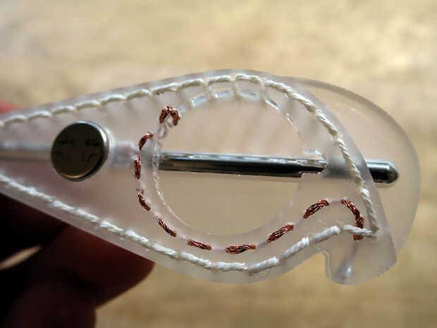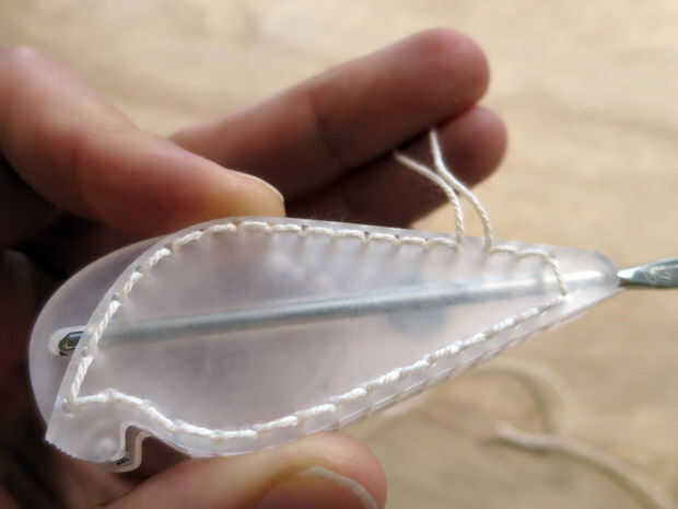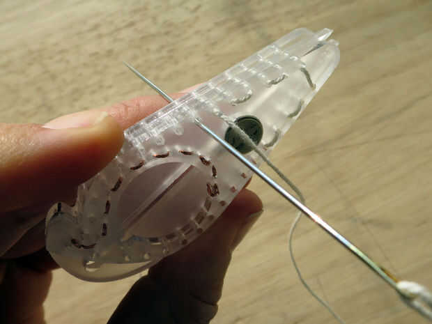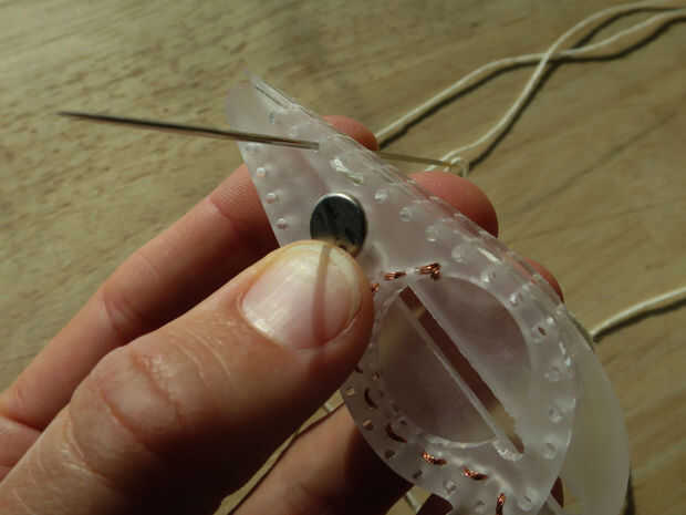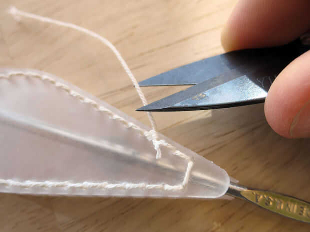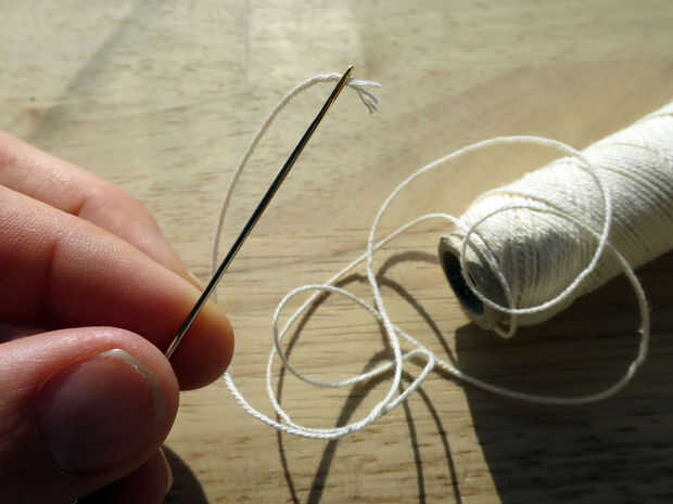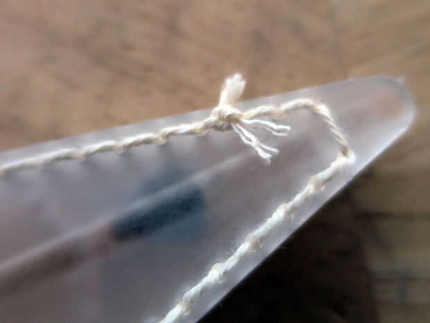 Ahora es el momento para coser las tres capas juntas. Enhebrar una aguja con el hilo grueso de algodón, luego apilar juntos sus capas. Asegúrese de que los orificios se alineen y el pin es en el lugar. Empuje la aguja a través de los agujeros de las tres capas y siga cosiendo alrededor. Cuando regreses a donde comenzaste, seguir alternando puntadas coser parecen en las fotos. Cuando haya terminado un doble nudo y corte los hilos cortos.