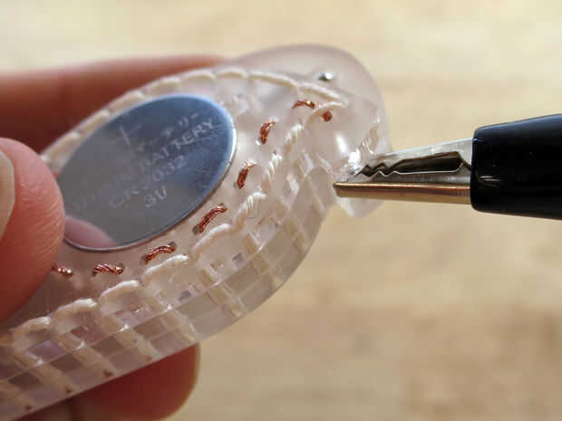 este vibrante gancho de ganchillo puede ser usado para medir la resistencia de un sensor elástico del ganchillo mientras se está realizando. Pueden medir continuidad y resistencia mientras que el sensor está siendo tejido en ganchillo. El motor de la