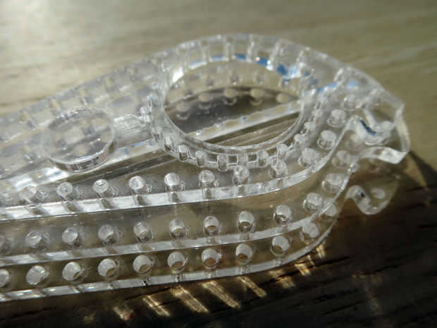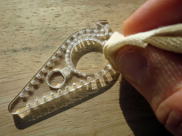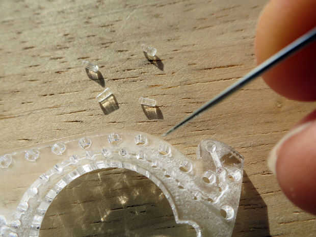 Después del corte de acrílico pegado en los agujeros pero usted debe poder a presión fácilmente hacia fuera con una aguja. También limpie los residuos con una tela de tejido o chatarra.