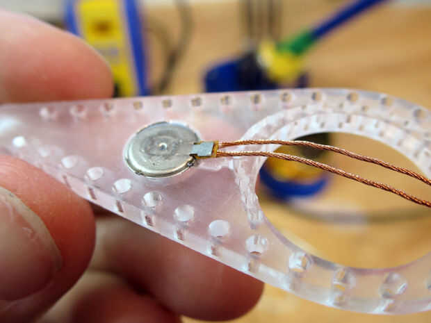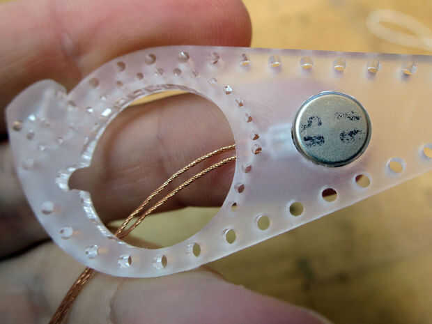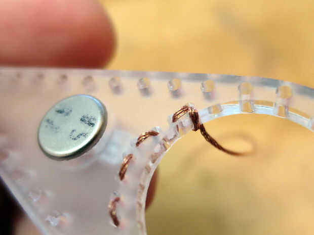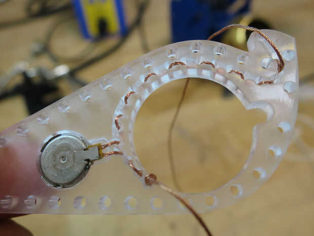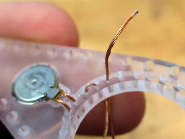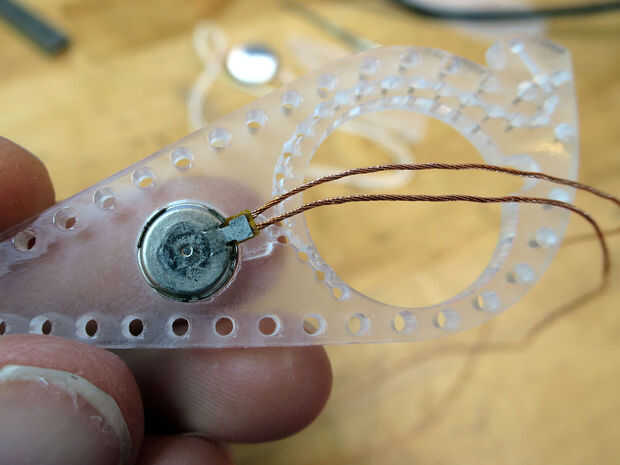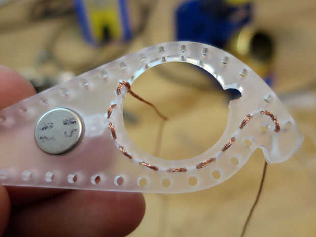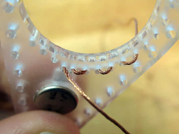 El motor debe quedar perfectamente en el agujero de lasercut con los puntos de soldadura sentado cómodamente en el hueco grabado. Puede estañar las puntas de los hilos conductores para que sean más fácilmente sewable. Comenzar a coser los hilos conductores dentro y fuera de los agujeros. Un hilo se termina a la desconexión de la batería y forma el contacto con el lado positivo de la batería. El otro hilo va a terminar en la punta donde hay un punto grabado.