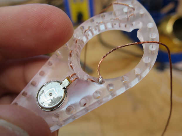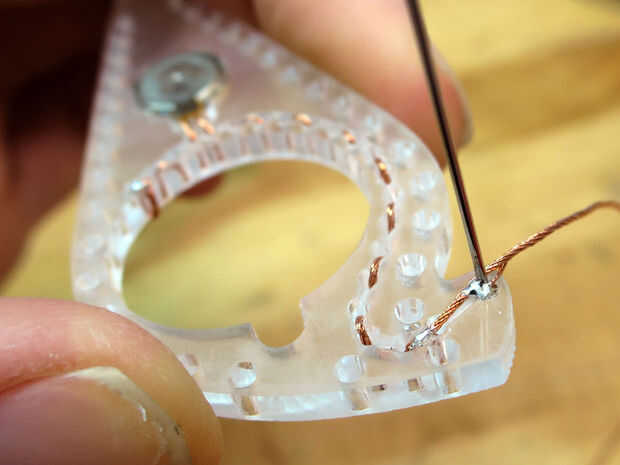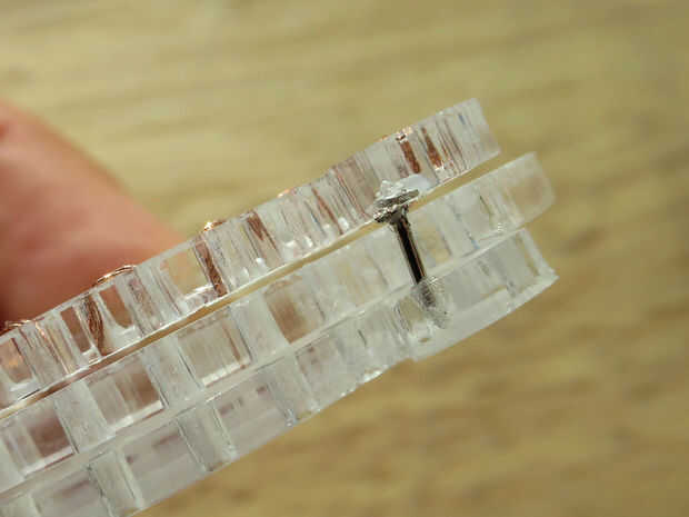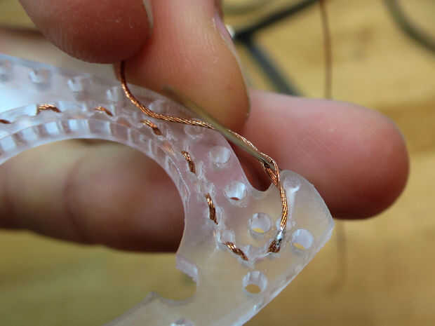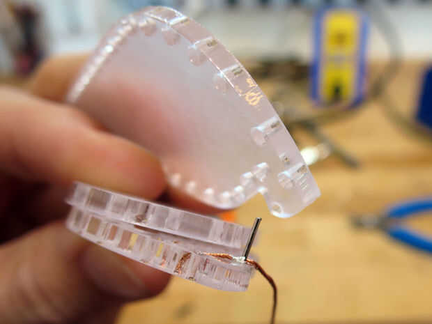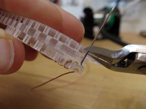 El hilo termina por el punto grabado debe conectarse a un perno que va entre los puntos en ambas piezas exteriores de acrílico. Inserte el pasador a través de las fibras del hilo y luego la soldadura en el lugar. Clip de la aguja para que sólo sea todo el tiempo que necesita poder mantenerse en su lugar por las dos capas externas cuando ellos se intercalan juntas.