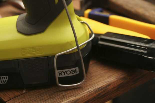 Otro ángulo recto hacia atrás hasta comienza formando el clip. Hay lógica en esto, intentos anteriores demostraron que una sola U forma hacia arriba y hacia abajo no era realmente lo suficientemente resistente para el peso de un taladro.