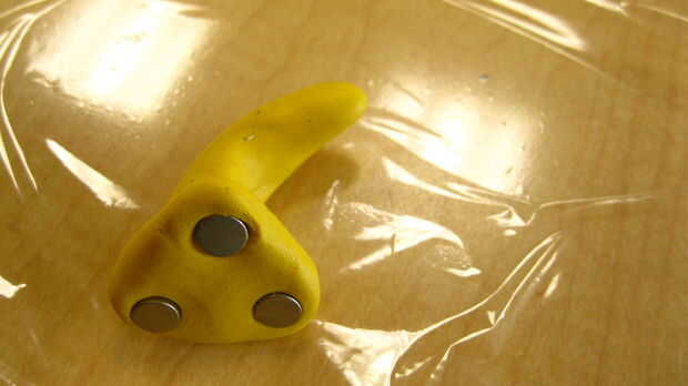 Coloque los imanes en la parte inferior del gancho, en cada una de las esquinas de la base triangular. Entonces, suavizar el Sugru cada imán, por lo que las cubre totalmente. Quieres la cubierta gruesa que los imanes no desgarrarse después, pero lo suficientemente delgada que no bloquearán su magnetismo. Lisa la parte inferior por lo que no hay costuras ni las arrugas, lo que es plano y suave posible - presionando el gancho en el plástico de la mesa cubierta de plástico puede ayudar con esto.
