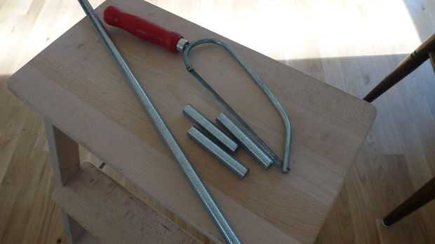 Ahora tenemos los ganchos. Les cortamos de una varilla roscada. Agarrar una barra roscada M12 de la cochera y una sierra de metal. He utilizo las cubiertas de zinc más baratas, pero es posible que la suerte de encontrar los acero inoxidable, que son probablemente más agradables en el final.