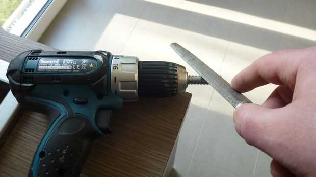 Coloque el taladro en una superficie sólida, gire a una velocidad media (en sentido horario) y usar el archivo para quitar los filos.
