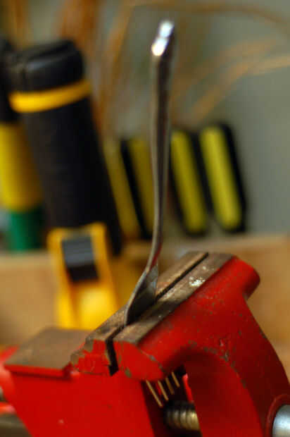 Todo lo que necesitas es un tenedor barato (compré un pack de cuatro en la tienda de dólar) y un tornillo de banco. Para colgar para arriba, se necesitan dos clavos.