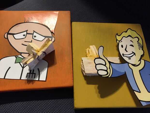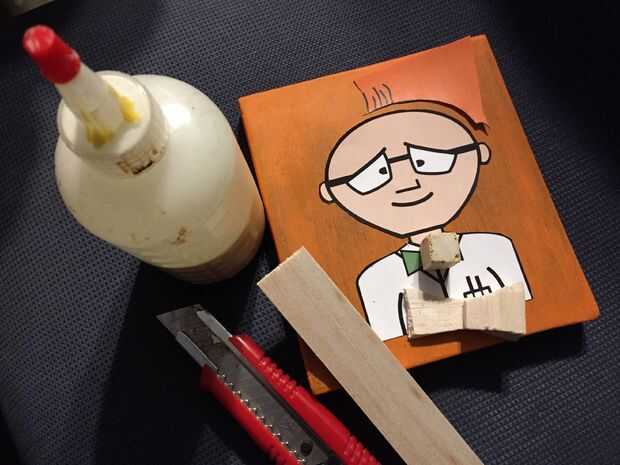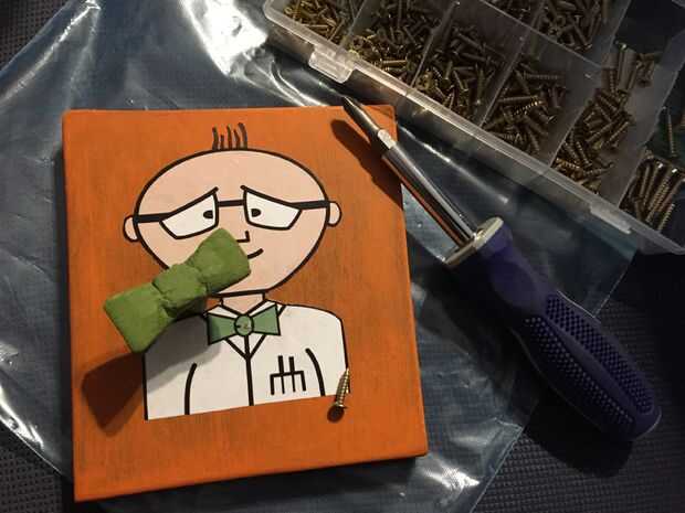 Para Kiteman, pegué abajo la imagen primero. Se perforaron agujeros en la base y la pajarita. Un tornillo de la parte posterior asegura la pajarita.