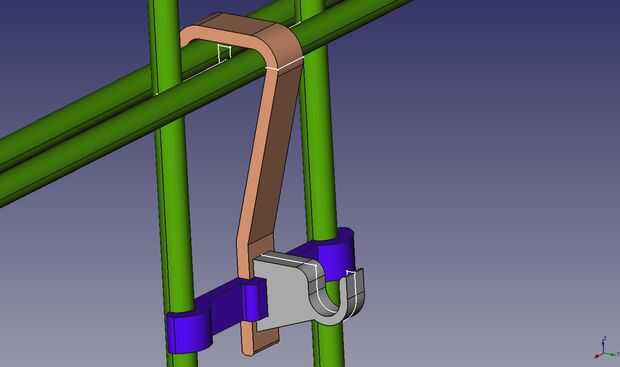 Abrazadera de la horquilla nombre parte (azul) en el gancho (rosa). Ponga el gancho de cable (gris) sobre él. Ayudará a la srceenshot de CAD. Ahora perfore el tornillo con cuidado desde detrás en arreglar todo a una unidad.