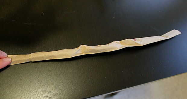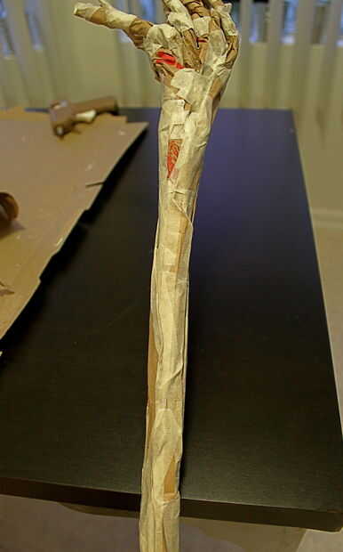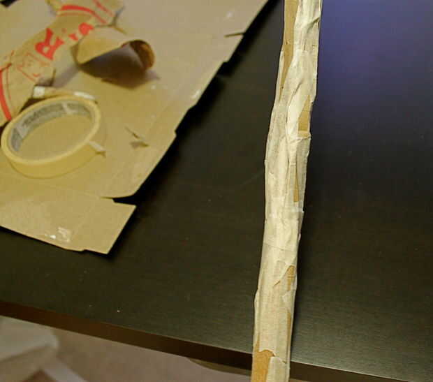 Tomó las manijas del bolso les arrugó un poco y graba a la mitad del personal. Esto añade cierta profundidad visual/textura con el resto de la espiga para que no sólo parecerá, así, un taco. Si sólo los bordes del papel de la cinta y dejar el medio suelta, dejando algo de espacio entre el papel y la espiga, puede exprimir el papel hacia abajo y hará surcos de aspecto realista más que simplemente hacer el papel "de piel apretada" alrededor de la espiga. Utilice la cinta adhesiva, como más adelante será más difíciles de camuflaje con pintura los bordes rectos.