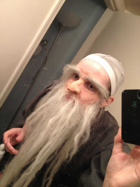 Después de los tres de esos pasos se hayan completado, agregar el bigote, utilizando incluso pequeñas cantidades de pelo aplicada sobre el labio. Crear las cejas de la misma manera (trabajando desde el exterior de tu ceja y yendo hacia adentro). Todo lo que queda es el maquillaje de la vejez. Crear arrugas, estiramiento de piel y látex de untar sobre el área. Secarlo con un secador de pelo (en la temperatura fría!) y obtendrá instantánea piel arrugada! Crear más arrugas y sombras maquillaje unos tonos más oscuros que tu piel natural y marcando las líneas debajo de tus ojos, tus ojos y por sus mejillas. Agregar también algunas manchas de vejez! Recuerde siempre fijar tu maquillaje con polvo después de haberte aplicado todo.